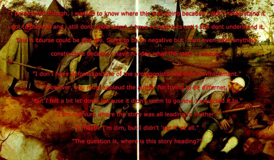 Part of my unofficial research on this website has involved uploading a range of my short stories and novel extracts, none of which conform to popular norms or genre conventions. And close analysis of several hundred samples of feedback from strangers diverse in age, gender, nationality, class and profession, has confirmed the warnings of experts: most readers read to find out what happens next. What’s more, they’ll often turn hostile if finding out demands too much effort. Most readers like to be spoonfed. Yet those rare readers who can hold the tension of not knowing where a narrative’s going are more likely to learn (and create) something new.