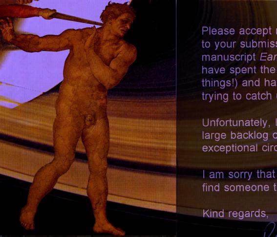 In the early days of receiving rebuffs from editors, agents and publishers, I was taken aback by their similarities. Like a visitor to a foreign planet, I couldn’t distinguish the aliens. Yet, two decades spent in transit between my small world and Planet Rejection has cleansed the doors of my perception, revealing an infinite range of styles. And, in the interests of going there less, or at least easing the ride, I’ve been training myself to read the subtext (most of which remains as obscure as cuneiform) only to find you can make the gaps between clichés mean whatever you want them to mean. Where do the gods of this ringed planet learn how to say no? It stands to reason that most have received rejections themselves, and may still be doing so. Presumably their skill has developed through trial and error + osmosis. In instances, such as major comps, where writers pay a stiff fee to submit, embellishment of the standard thanks-but-no-thanks is politic. These personal touches, while general in scope, are sometimes evocative, e.g.: